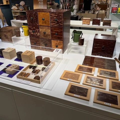 この度は表情豊かな異なる山桜の樹皮を一つのチェストでお楽しみいただける「チェスト9」をはじめ、高さのあるものも収納出来る引き出しの新作、歴代の名工、伝統工芸士の逸品など展示販売いただいております。